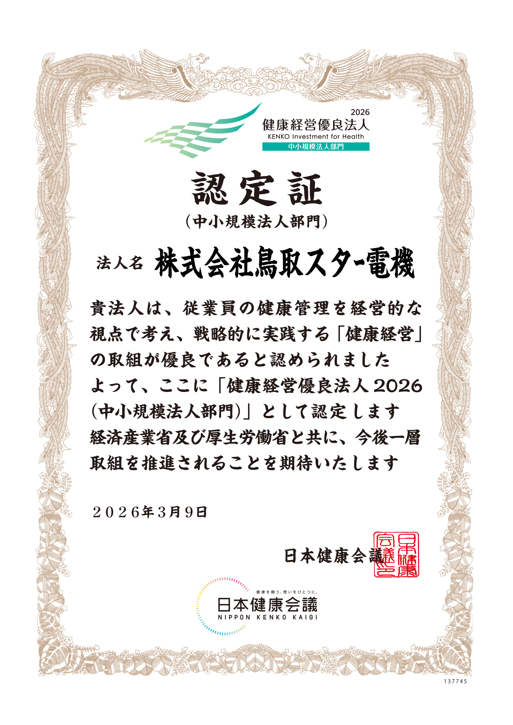 2026年3月9日、経済産業省と日本健康会議が共同で進める「健康経営優良法人 2026(中小規模法人部門)」に認定されました。